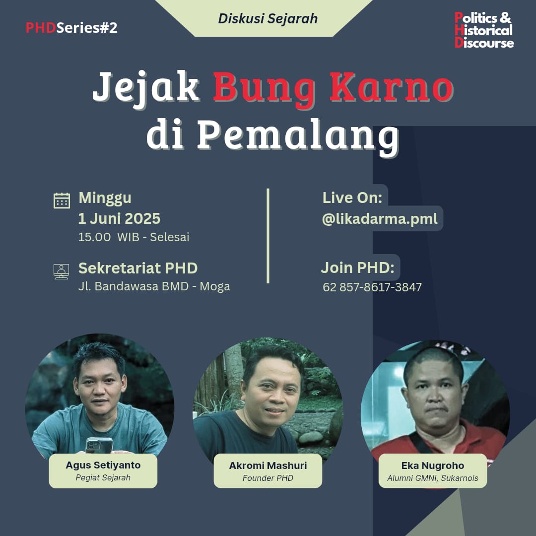 Dalam rangka memperingati Hari Lahir Pancasila pada 1 Juni, forum kajian Politics and Historical Discourse (PHD) menggelar diskusi sejarah dengan tema Jejak Bung Karno di Pemalang. Acara digelar di Kantor Sekretariat PHD, Jl. Baja Perumahan Graha Samira Moga, Sabtu (1/6). Kegiatan ini dihadiri oleh pegiat sejarah Agus Setiyanto, alumni GMNI Eka Nugroho, serta para aktivis di Pemalang.