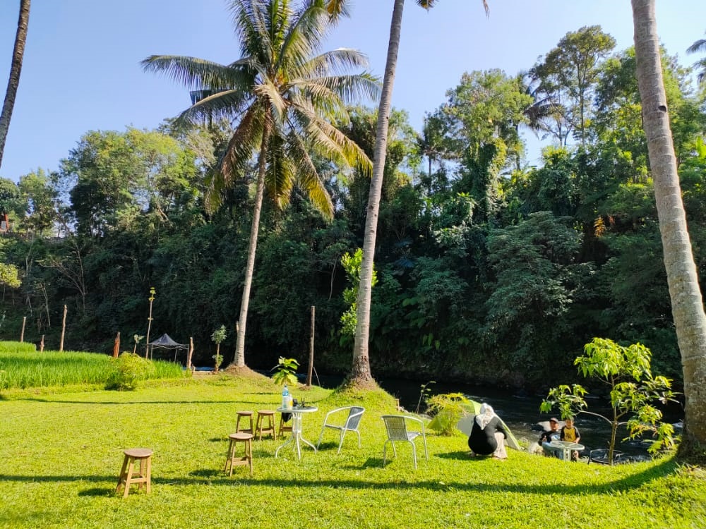 Nantinya pengunjung juga bisa duduk-duduk santai di bawah kafe. Bawah kafe ini berupa sebidang tanah berumput alami persis di pinggir Sungai Comal.