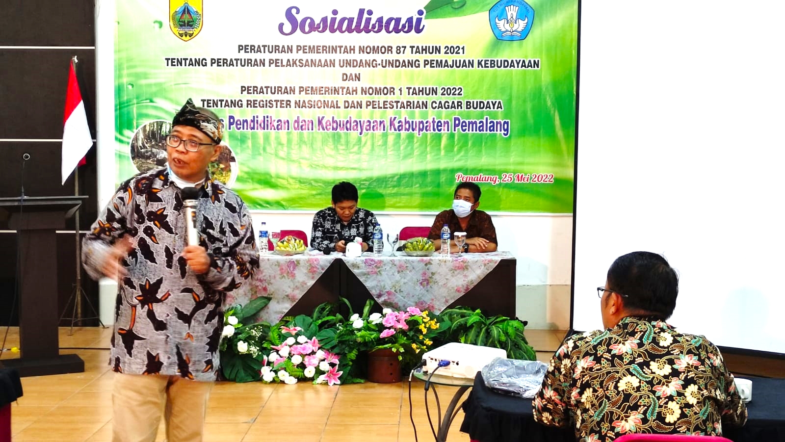 Dinas Pendidikan dan Kebudayaan (Dindikbud) Kabupaten Pemalang menggelar Sosialisasi Peraturan Pemerintah Nomor 87 Tahun 2021 tentang Peraturan Pelaksanaan Undang-Undang Pemajuan Kebudayaan dan Peraturan Pemerintah Nomor 1 Tahun 2022 tentang Register Nasional dan Pelestarian Cagar Budaya. Acara berlangsung di Hotel Winner Premier Pemalang, Rabu 25 Mei 2022.